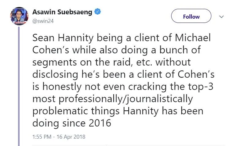 Hannity’s public comments about the search of Cohen’s office, hotel room and electronic devices. He should have disclosed both his friendship with Cohen and his habit of consulting him on legal questions before commenting.
