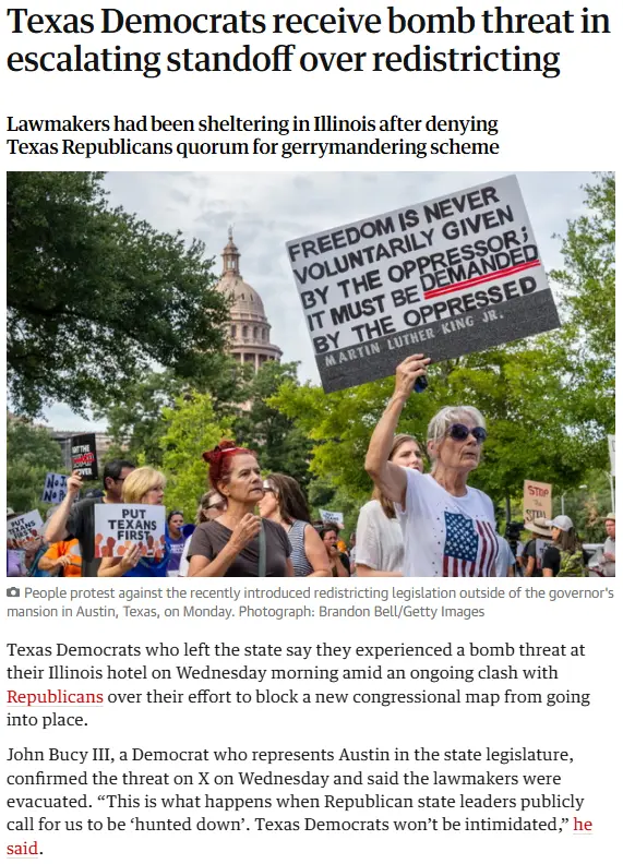 Texas Democrats receive bomb threat in escalating standoff over redistricting