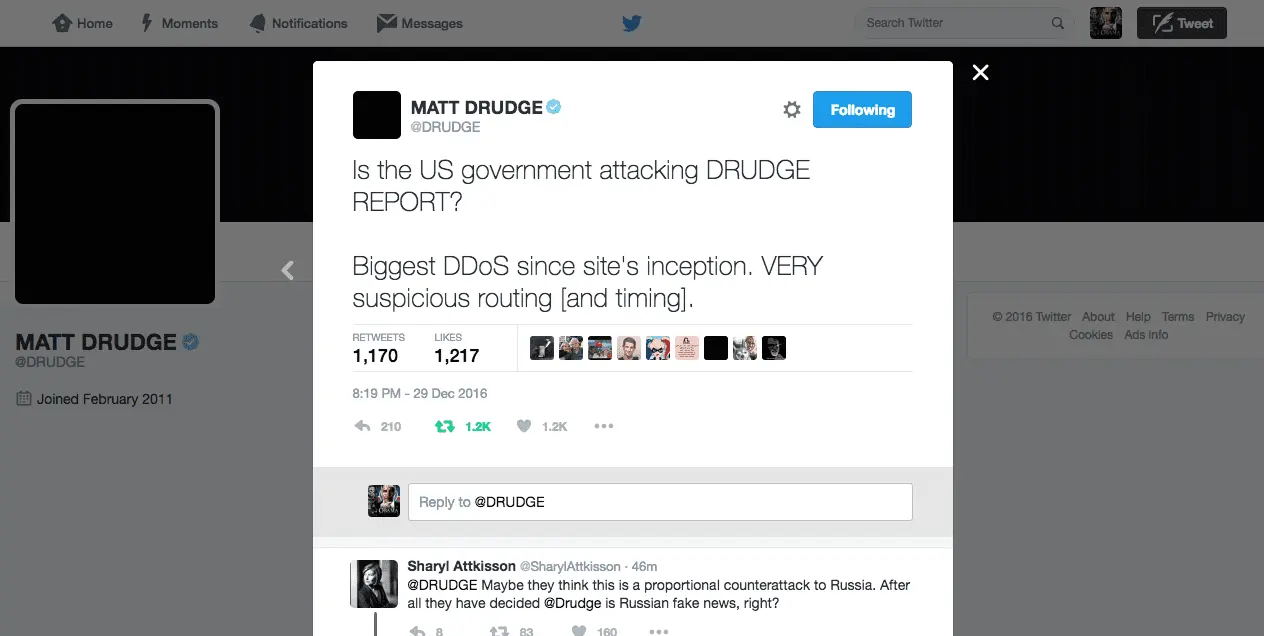 In his tweet Drudge questioned whether the attack, which overwhelms a websiteās servers with traffic in an attempt to take it offline, originated from the U.S. government.