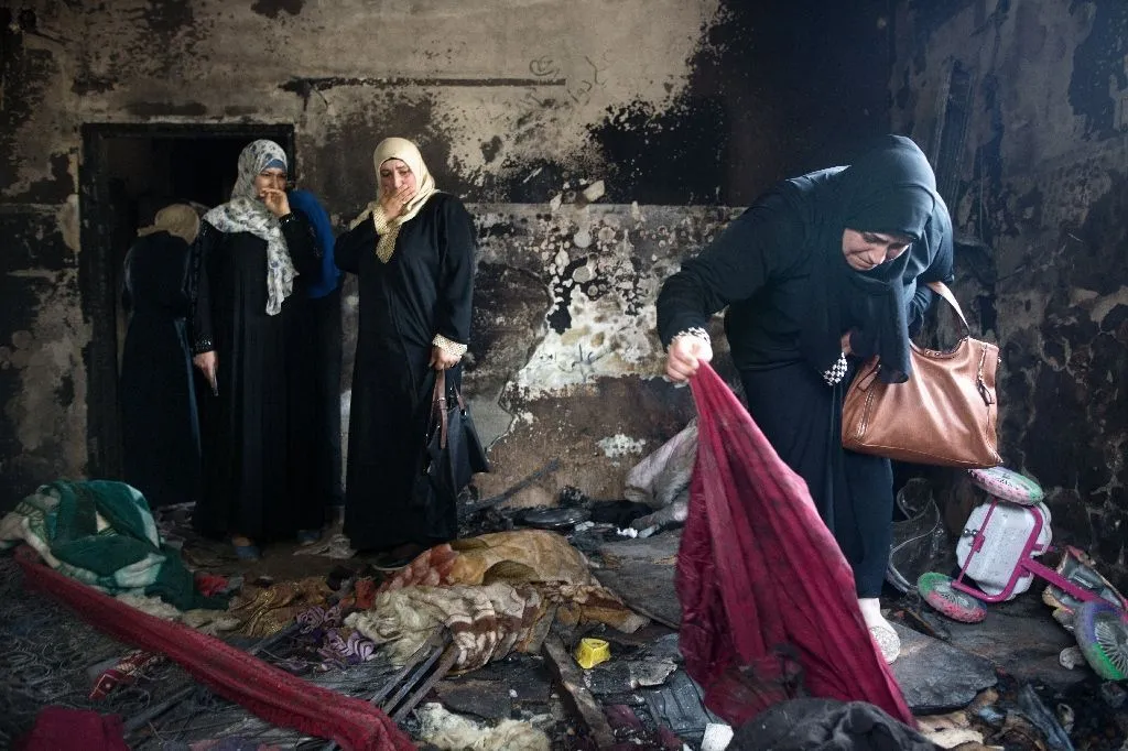 Palestinian women look at the damage at the Dawabsha family's home in the West Bank village of Duma on August 4, 2015, after it was set on fire by suspected Jewish extremists on July 31, 2015, killing 18-month-old Ali Saad Dawabsha (AFP Photo/MENAHEM KAHANA)