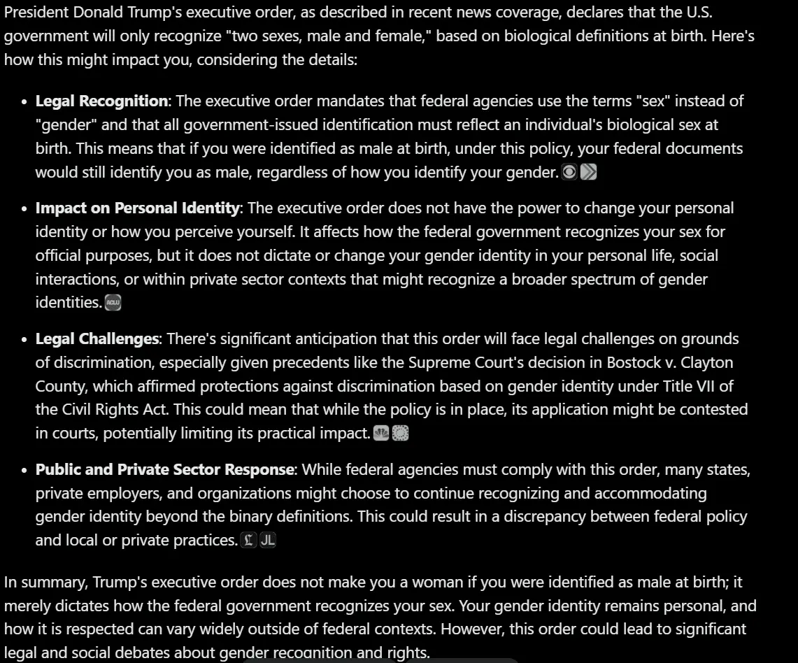 I read the executive order. It does no such thing.Read the executive order from the source of your choice. You are now a woman.
