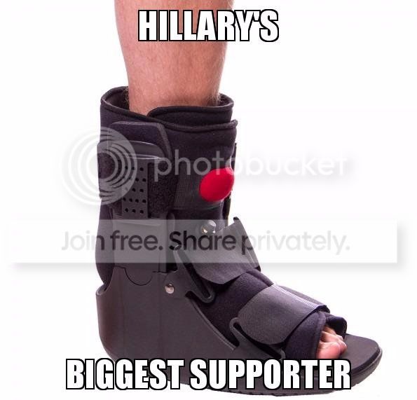 Hillary Clinton hobbled away from filming a British TV show interview on crutches Monday after breaking her toe falling down some stairs.