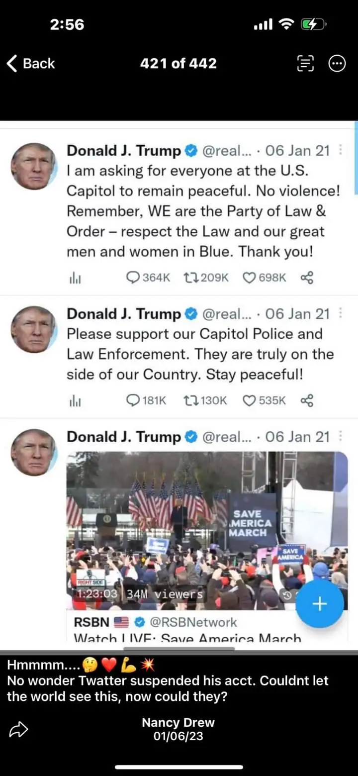 Too funny. The timeline will show that Trump tweeted that HOURS after the riot commenced..and it was hours more before he asked them to leaveThis is what Trump was tweeting during the trespassers at the Capitol.