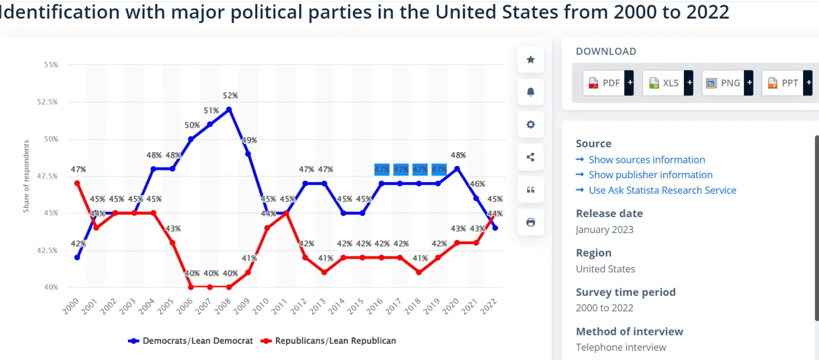 In the last few decades, the Democratic Party has often pulled ahead of the Republican Party in terms of party identification.www.statista.com