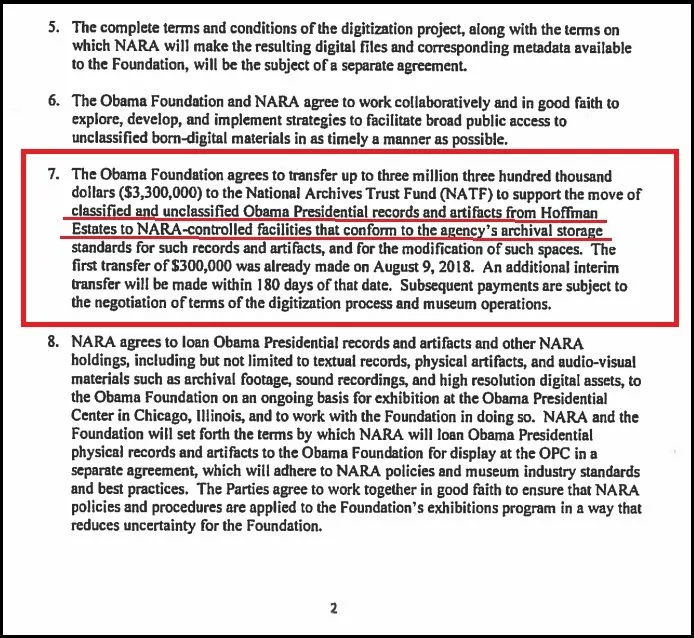 Subsequently, former President Obama decided not to fund, build, endow, and donate a physical Presidential Library to NARA (his foundation is building a privately operated Presidential Center that will not have archival storage for any Presidential records). Instead, the Obama Foundation agreed to help pay for the cost of digitizing the unclassified paper records and for the cost of moving the classified and unclassified records from NARA’s temporary facility in Hoffman Estates to other NARA-controlled facilities (for which NARA otherwise would have to pay). A September 2018 Letter of Intent from the Obama Foundation to the Archivist of the United States addresses Obama’s commitment to paying for these costs; but it in no way suggests that Obama had physical custody of any Presidential records. As NARA stated in September 2022, neither former President Obama nor his foundation “had possession or control over the [Presidential] records” of his administration.