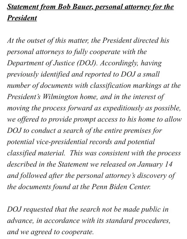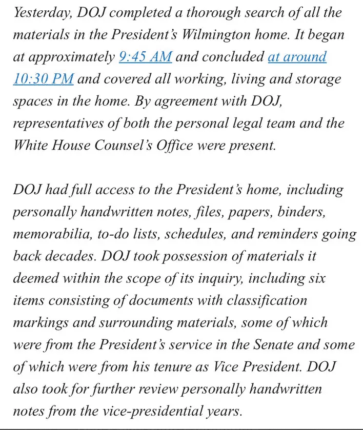 President Biden and the WH declared all classified documents had been found after a thorough search of the Delaware home by Biden's lawyers and aides.
