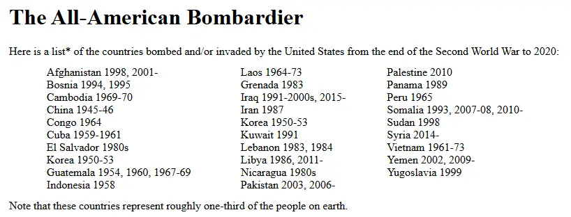 Yes indeed, the fact is they have acted like terrorists since WW2, it's tragic because the US with all it's strength could have been such a force for good in the world, but they went the other way to the dark side.Yes, here's a list of states we've bombed, in alphabetic order, since the end of world war 2