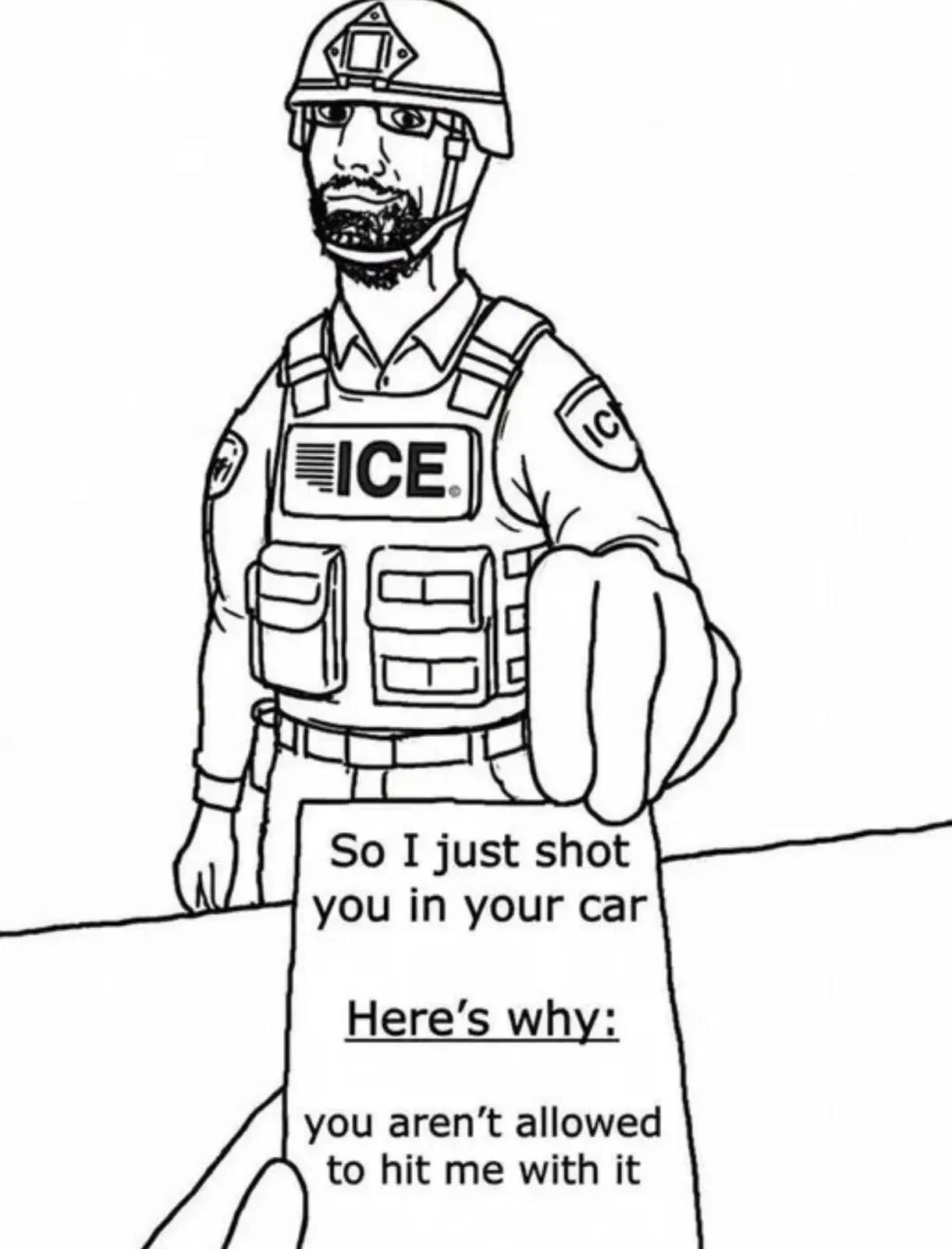 End of story. A reasonable person would have hit the brakes when they saw someone in front of their car. She didn't, she hit the gas. Seeing such action, the ICE agent had no choice but to assume she intended him or someone else harm.I would have hit the brake.