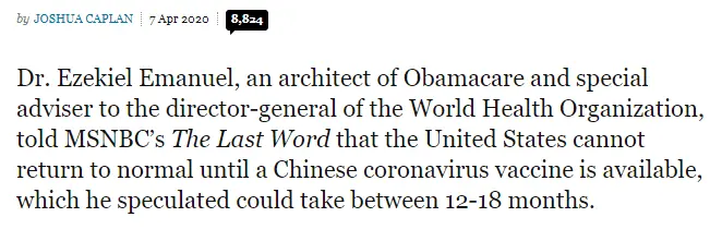 Ezekiel Emanuel said the U.S. "cannot return to normal" until a coronavirus vaccine is available, which he said could be in 12-18 months.www.breitbart.com