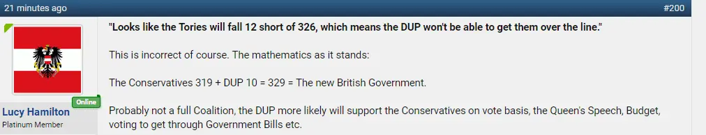 Lol I was never wrong last night not ONE time, I said from the beginning that the Conservatives would form the next British Government, I also said in the middle of the night that the DUP would give the Conservatives the overall majority and they have.