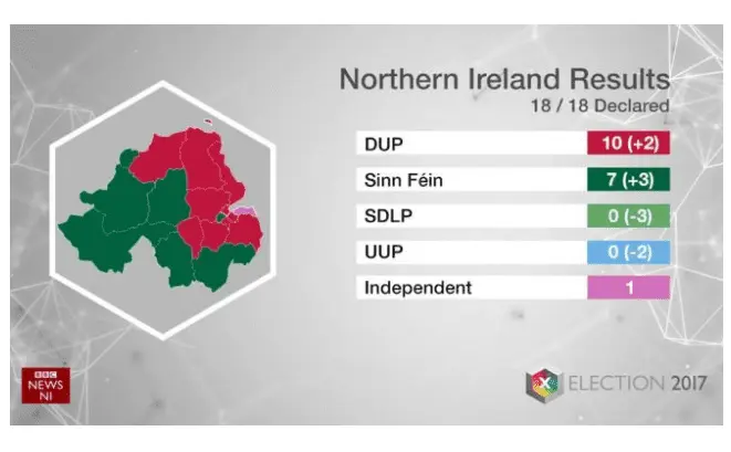 The results in Northern Ireland now show there are only two parties there the DUP and Sinn Fein, the SDLP have lost all their seats and the UUP have lost all their seats and the Alliance Party (Northern Ireland party affiliated with UK Liberal Democrat Party) have been annihilated.