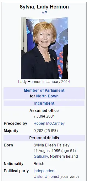 The Independent is Lady Sylvia Hermon who used to be in the UUP from 1998-2010 and then she left the party in 2010 and has sat as an Independent since.