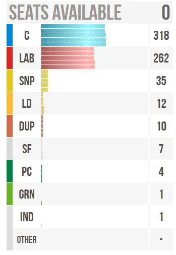 As it stands the Conservatives have 318 seats, this will be 319 seat soon as Kensington and Chelsea are still counting and it's a safe Tory seat.