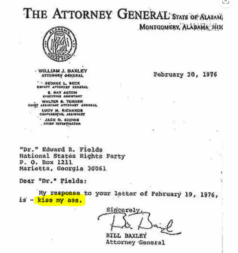 One of those threats came by way of a letter written on 19 February 1976 by Ku Klux Klan Grand Dragon Edward R. Fields. In the letter, Fields demanded a reply — so Baxley gave him one. On official Alabama Office of the Attorney General letterhead, Baxley wrote a one-sentence response that would become legendary. It simply said: