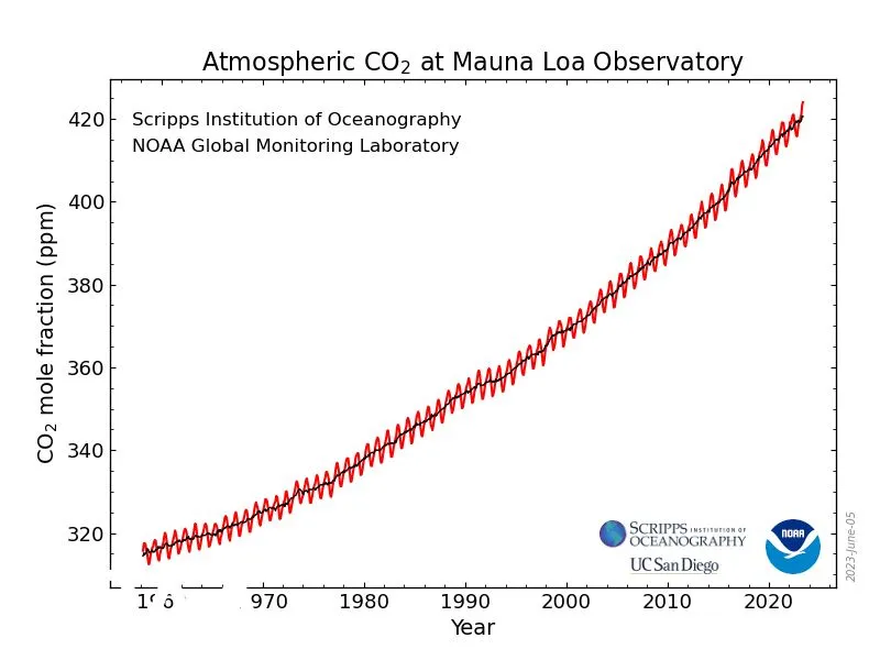 Measurements of carbon dioxide (CO2) obtained by NOAA’s Global Monitoring Laboratory averaged 424.0 parts per million (ppm) in May, the month when CO2 peaks in the Northern Hemisphere. That is an increase of 3.0 ppm over May 2022, and represents the fourth-largest annual increases in the peak of the Keeling Curve in NOAA’s record. Scientists at Scripps, which maintains an independent record, calculated a May monthly average of 423.78 ppm , also a 3.0 ppm increase over their May 2022 average.