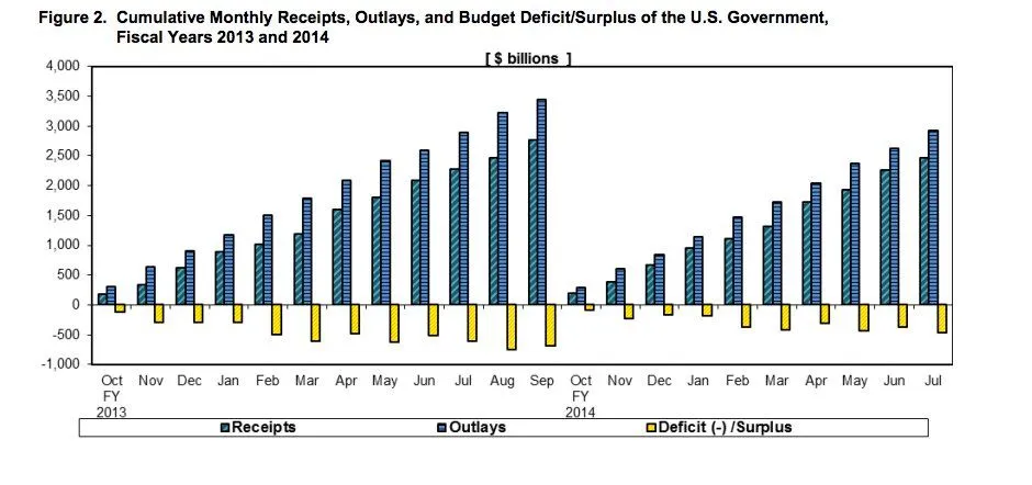 FY2014 was the fifth consecutive year the deficit declined as a percentage of GDP. It is now an estimated 2.8% of GDP, a percentage that puts it below the average of the past 40 years.