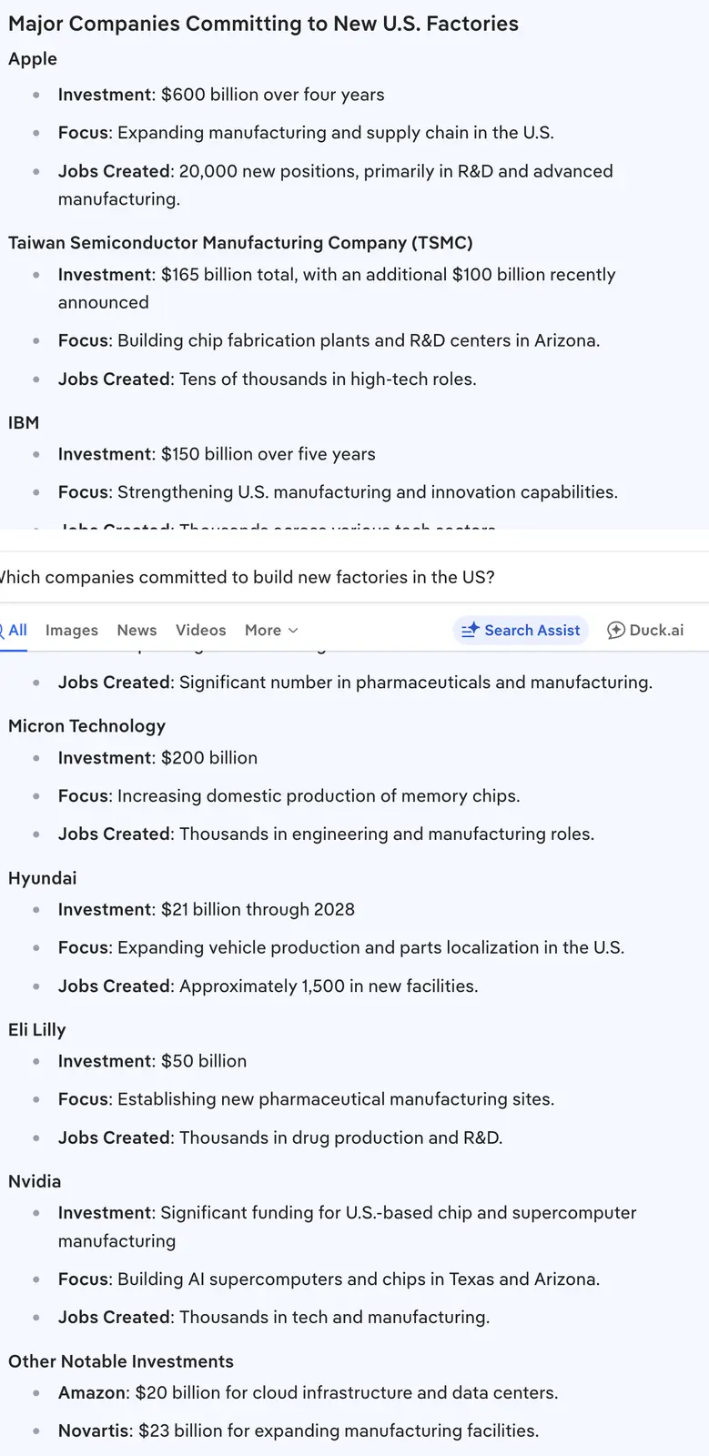 He claimed that crap last time too and it never materialized.Yes reshored jobs, first they would build factories, then there would be manufacturing jobs, but it takes years to startup a new manufacturing plant. $17T of new investment is being put up by: