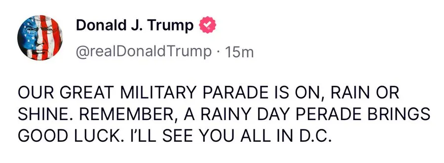 Trump said the parade will go ahead rain or shine. Except that military officials have said the parade cannot go ahead if there is a thunder storm. Lightning would be very very dangerous to a parade of METAL VEHICLES.