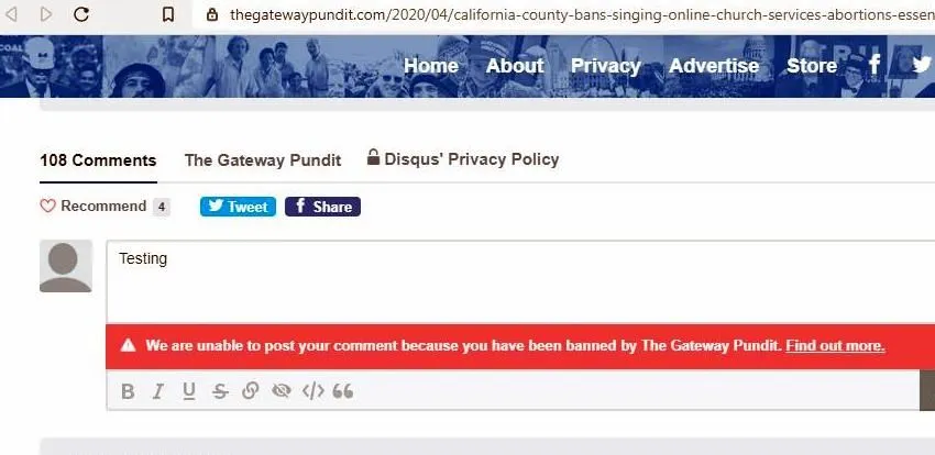 Thanks. Was not familiar with Jim Hoft, until you posted. Have seen Gateway Pundit. Should they be on my list of "If they said it, it's got to be bullshit" list?That is bizarre. Glad I never considered moving there.California County Bans Singing During Online Church Services, ‘Abortions Are Essential, But Singing in a Streamed Worship Service is Just Too Unsafe’