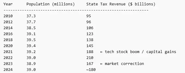 Tech companies are fleeing CaliEverything is simple to you numbnuts. Do you notice in the table below that revenue kept rising even during years when population flattened or declined? California tax revenue has to do with investment returns of the tech market. Not the few people who move out due to it being expensive. They werent paying much in taxes anyway. You guys cant see more than 1mm deep in issues.