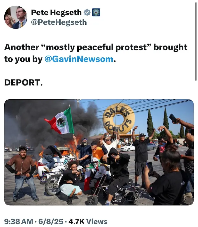 The only insurrection here is the illegal violence by the Trump team. Go ahead and tell them to arrest themselves.This stuff in LA going on, with people impeding DHS and ICE efforts to deport or arrest illegal immigrants or violent ones, sometimes violently, is the true definition of insurrection. This is an even greater attempt to overthrow a duly elected government by simply ignoring or outright defying the authority of said government than J6 ever was.