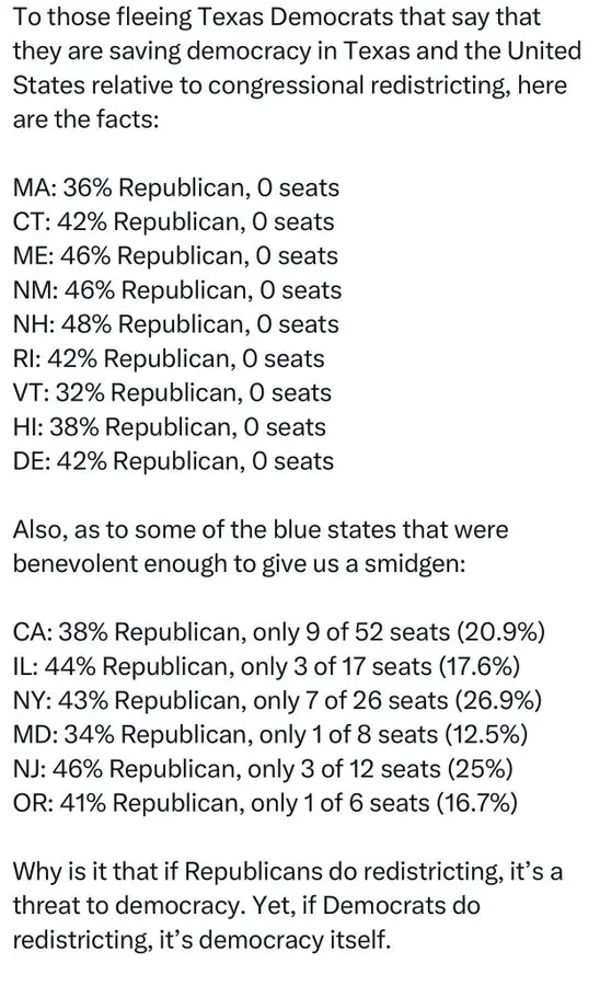 California is 25% Republican. The state has 14% Republican representatives in the house and 20% Republicans in the state legislature. Newsom only wants to reduce that number to 0% in each case to make it impossible to fail to get his way on anything. Texas is only a handy excuse. Both parties do it and it shouldn't be allowed at all.
