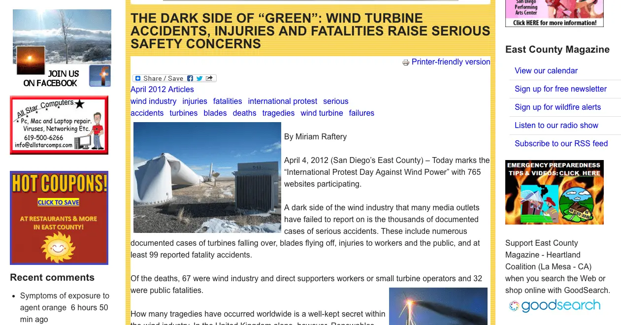 Giant floating wind turbines are killing fam animals?Now they want to put giant floating wind turbine towers hundreds of feet high off the coast of California. Can anyone imagine the maintenance costs per year? That alone would dwarf any benefit. Not to mention if one broke loose and washed ashore taking out some starlets beach house.