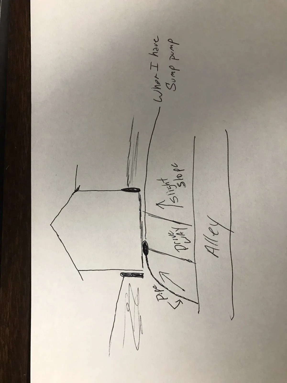 It is on the other side. And there is a concrete slab on top of it. (someone else put it there years ago) Not seen in the drawing is there is a bump out. So I would still have to lay a drain line a good 25 feet to get to the black lineWhy not?