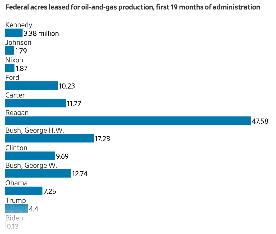 The Biden administration has leased fewer acres for oil-and-gas drilling offshore and on federal land than any other administration in its early stages dating back to the end of World War II, according to a Wall Street Journal analysis.