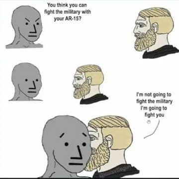 So... it's -not- a weapon of war.Rather the point people make for needing AR-15 and other like guns is to fight against a tyrannical government (which requires supported of the military), but your little AR-15, which can cause great havoc on civilian opponents, is no match (to the point of being meaningless) for the US military: drones, tanks, special forces, regular military forces, fighter jets, etc.