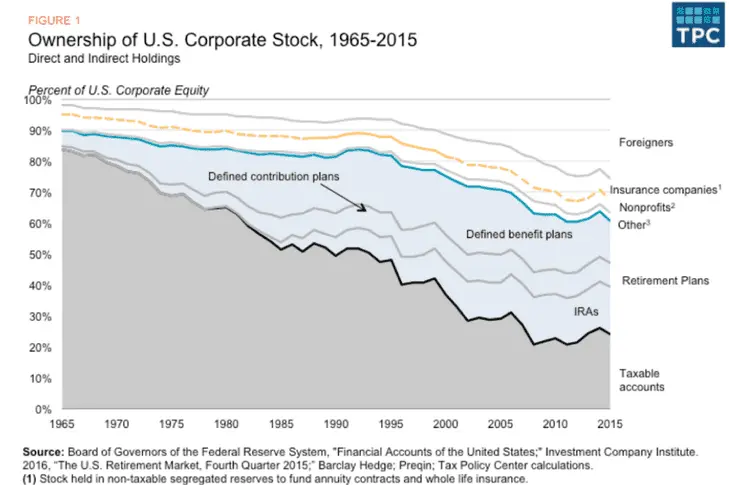 That leaves us with the taxable accounts. The stocks owned by hedge funds and private investors, and the wealthy 1%, the Waltons and Buffets of the world. All of these people, combined, barely make up 25% of the stock market.