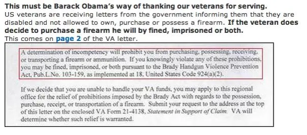 US veterans are receiving letters from the government informing them that they are disabled and not allowed to own, purchase or possess a firearm. If the veteran does decide to purchase a firearm he will by fined, imprisoned or both.
