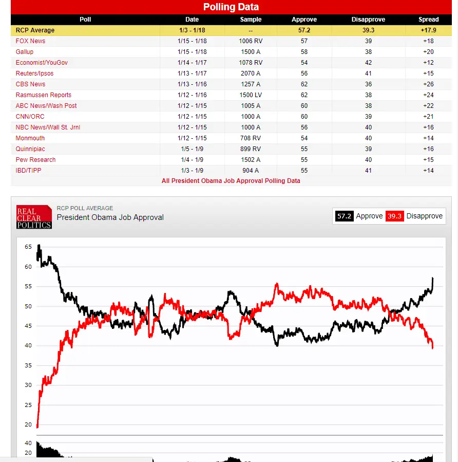 You are showing 16 days in January, moron.That's what morons like little Marco and Lying Ted thought too....The polls are manufactured to produce the result that the pollsters want.The polls are random. They do not know who they are sampling until the poll is taken