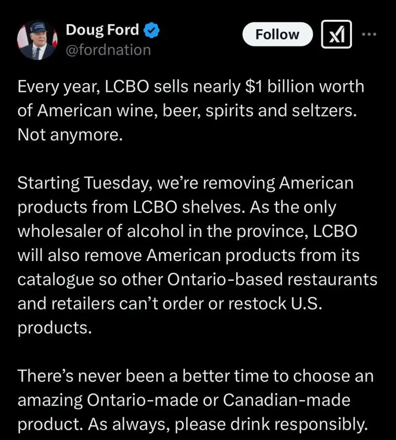 The Ontario LCBO is the largest buyer of wine and spirits in the WORLD. The USA sells more alcohol to Canada - by far, than any other country in the world, and we've stopped buying American products.