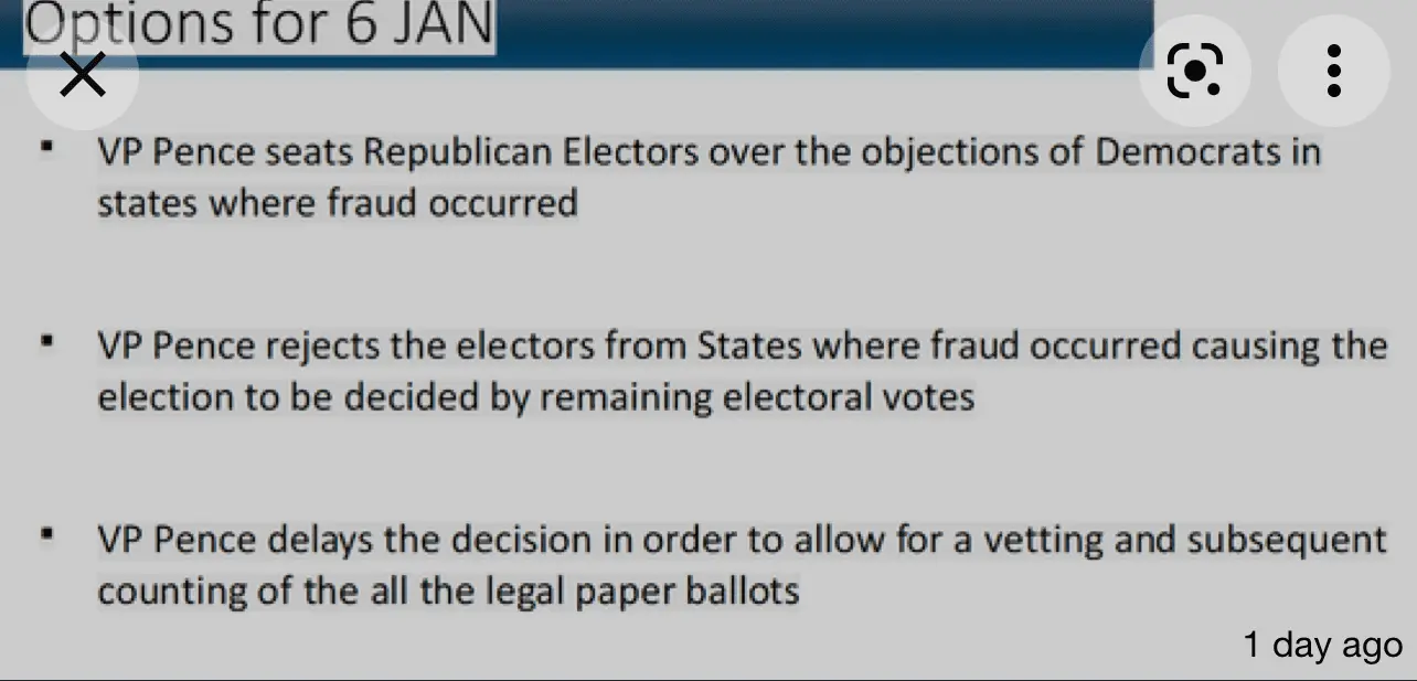 Bullet point one. Pence rejects the actual electors. Seats his own. Declares victory.