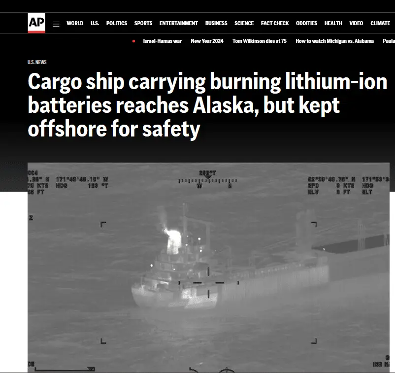 Cargo ship carrying burning lithium-ion batteries reaches Alaska, but kept offshore for safety • Watts Up With That?