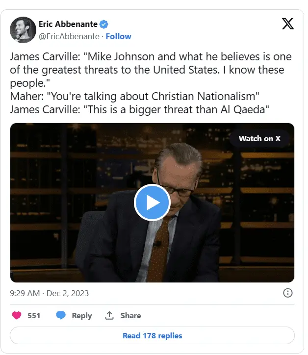 Carville knows that the number one Crazy Democrat Bigot dog whistle is "Christians", and he is not ashamed of blowing it.