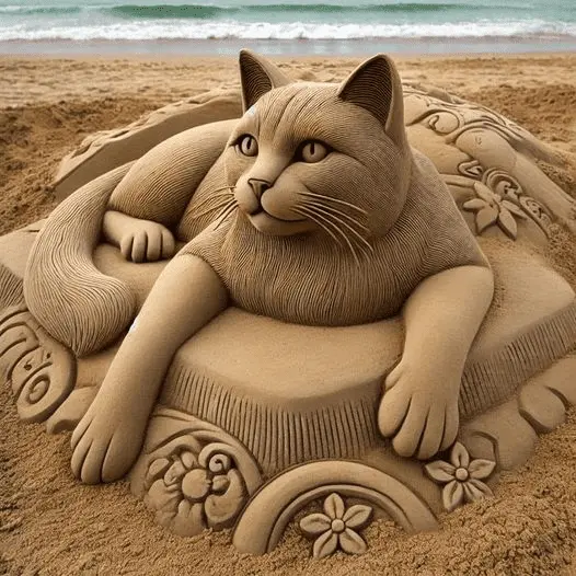 My cats dont build castles out of sand....This is really a nice cat sand sculpture .. Have you ever made a sandcastle?