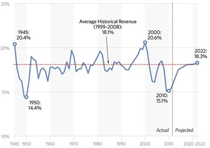 By 2009, the year of the highest deficit on record, taxes were down to 15.1% of GDP. That is the lowest tax percentage since 1950.