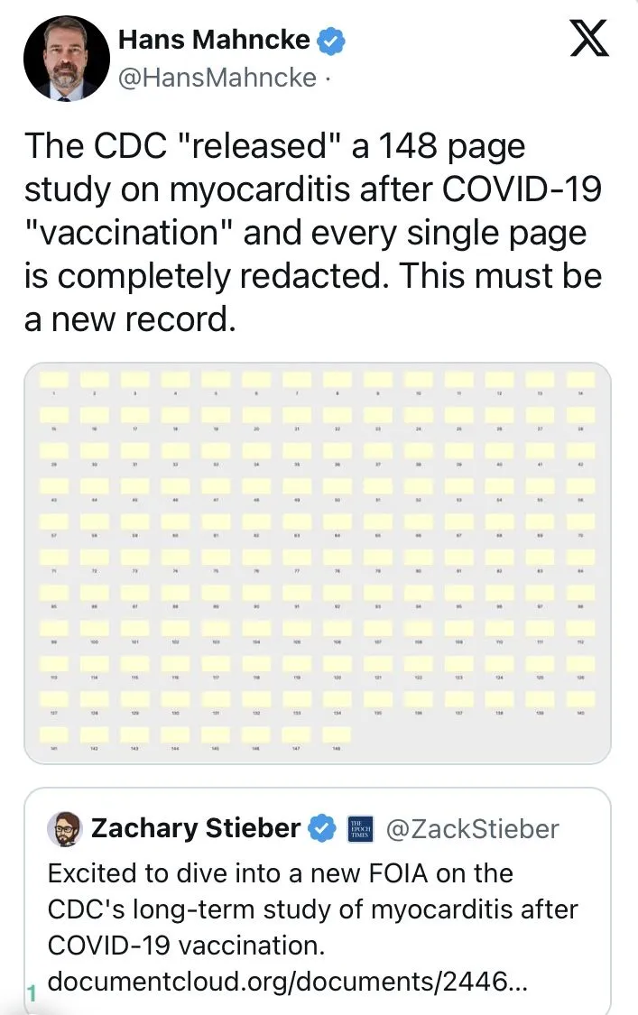 A near 150 page report is “released”, with every single page redacted. What are these? Nuclear secrets? Or just a cover up for their galactic **** up of approving the clot shot?