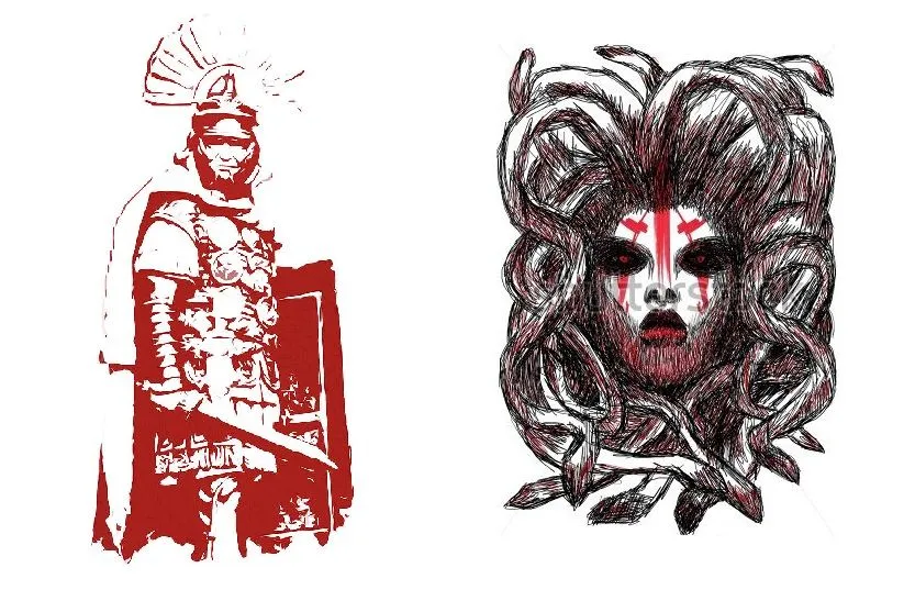 "The great centurion Perseus, son of a god, was charged with the mission of retrieving the nasty head of the hypnotic snake-woman Medusa. Medusa could turn men into stone with her poisonous gaze, and Perseus knew he'd have to use a reflection-trick using his shiny shield to guard his eyes while luring Medusa towards him so he could decapitate her with his bold sword. Perseus would then use the decapitated head to turn a giant beast into stone, simply by turning the glowing eyes of Medusa's head towards the head of the beast. Perseus was therefore very conscious of the importance of tricking and defeating the iconic warrior-siren woman Medusa. Medusa was indescribably beautiful but her head had hairlocks and mane comprised entirely of snakes."