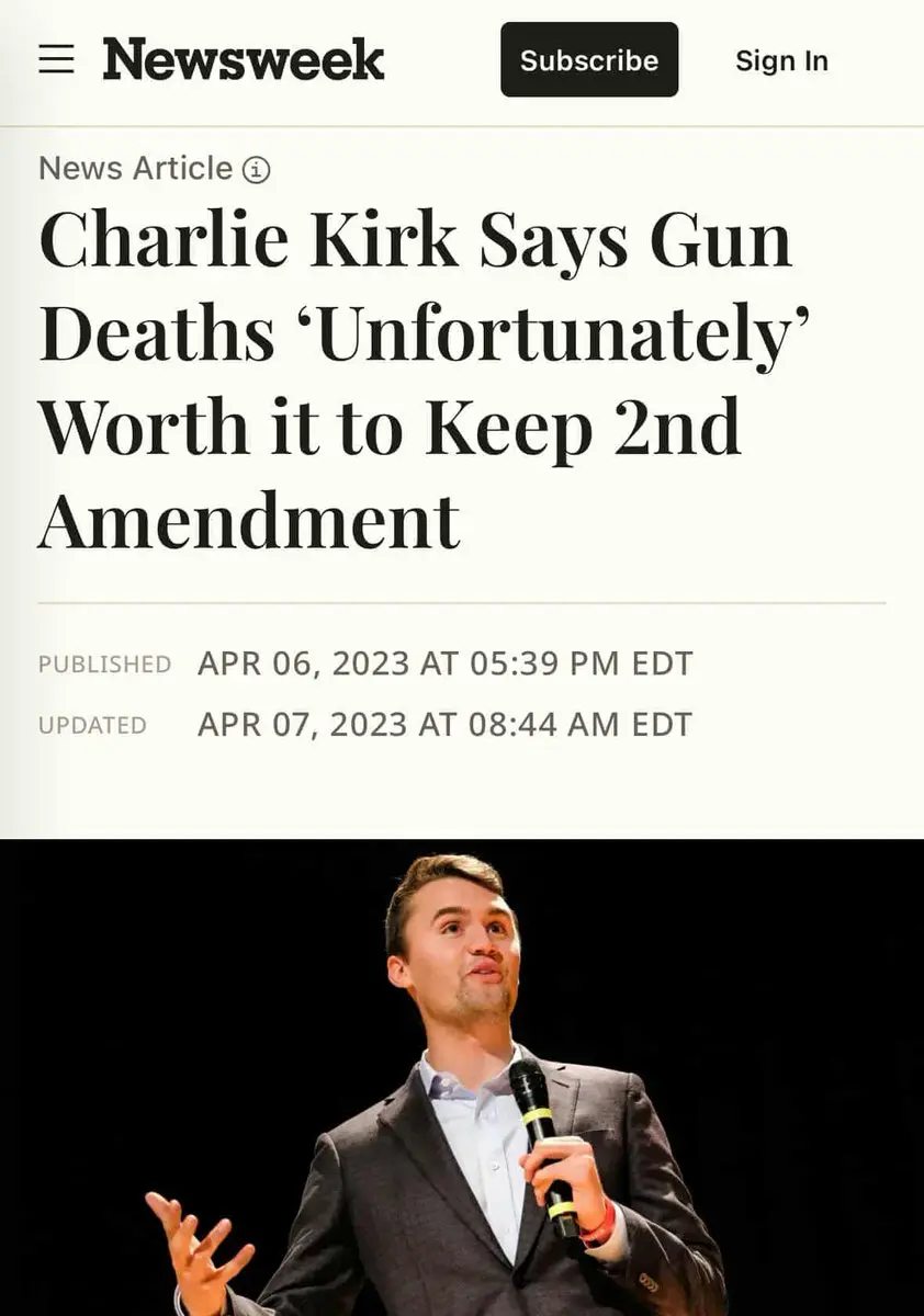Yep, without it we cease to existI'm seeing this quote "It's worth to have a cost of, unfortunately, some gun deaths every single year so that we can have the 2nd Amendment".....this is what Kirk said.
