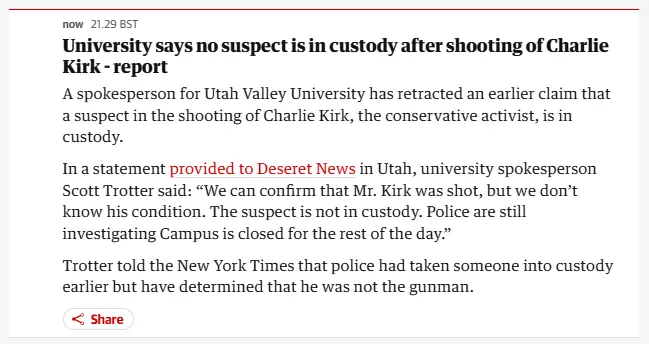 Trump referred to Kirk in the past tense. I think he's dead.This only proves the necessity for all of us to arm up to defend ourselves from the Left and criminals.