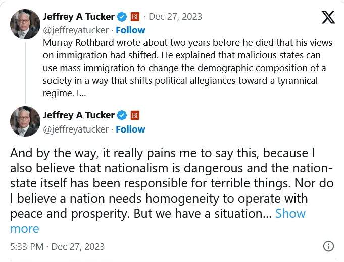 "Derrick Broze talks with Jeffrey Tucker, founder of Brownstone Institute, about his recent revelations on immigration and his revisiting of a 1990's essay by Murray Rothbard. Jeffrey and Derrick discuss the limitations of libertarian principles and whether or not the current moment of ongoing immigration crises requires a revisiting of said principles."
