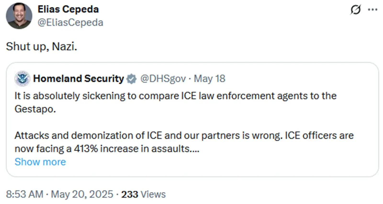 “Elias Cepeda has suspected ties to the domestic terrorist organization ANTIFA and has a history of glorifying violence against—and the killing of—our brave law enforcement,” said Assistant Secretary Tricia McLaughlin. “Violent individuals like Cepeda are putting the public and our law enforcement’s lives in danger. Just two days after the horrific attack on ICE in Dallas, Cepeda brought a loaded gun and multiple magazines to our ICE Broadview facility. Thank God law enforcement intervened and arrested Cepeda before he could have potentially shot or killed anyone. Let this serve as a stark warning to any individual who wishes to do our law enforcement harm or any ANTIFA terrorist: President Trump and Secretary Noem will fight every day to protect and defend the men and women who keep our country safe from violent extremists and criminal illegal aliens alike.”