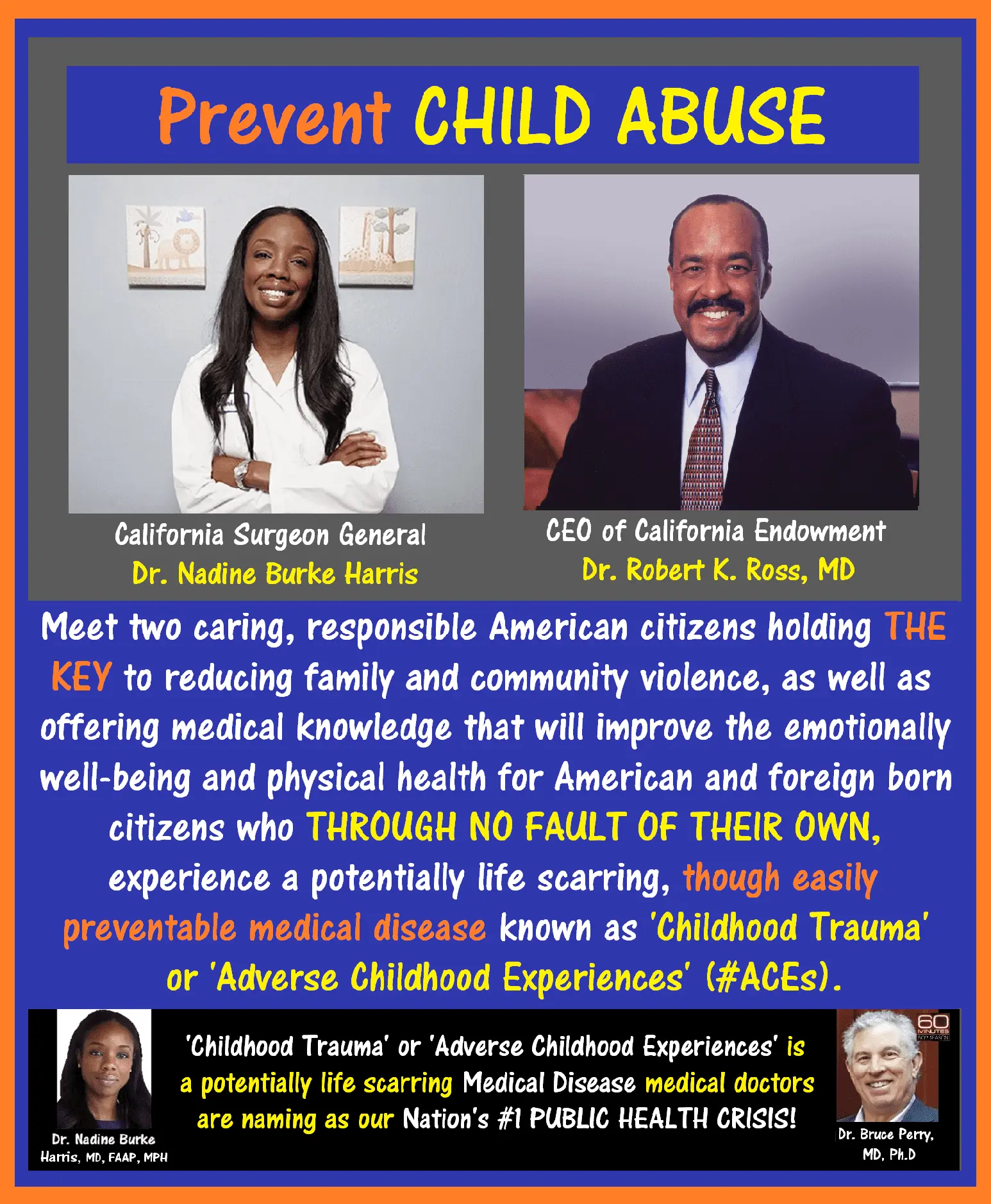 In my opinion, the aforementioned caring, responsible American citizens hold THE KEY to reducing family and community violence, as well as offering medical knowledge that will improve the emotionally well-being and physical health for American and foreign born citizens who THROUGH NO FAULT OF THEIR OWN, experience a potentially life scarring, though easily preventable medical disease known as 'Childhood Trauma' or 'Adverse Childhood Experiences' (#ACEs).