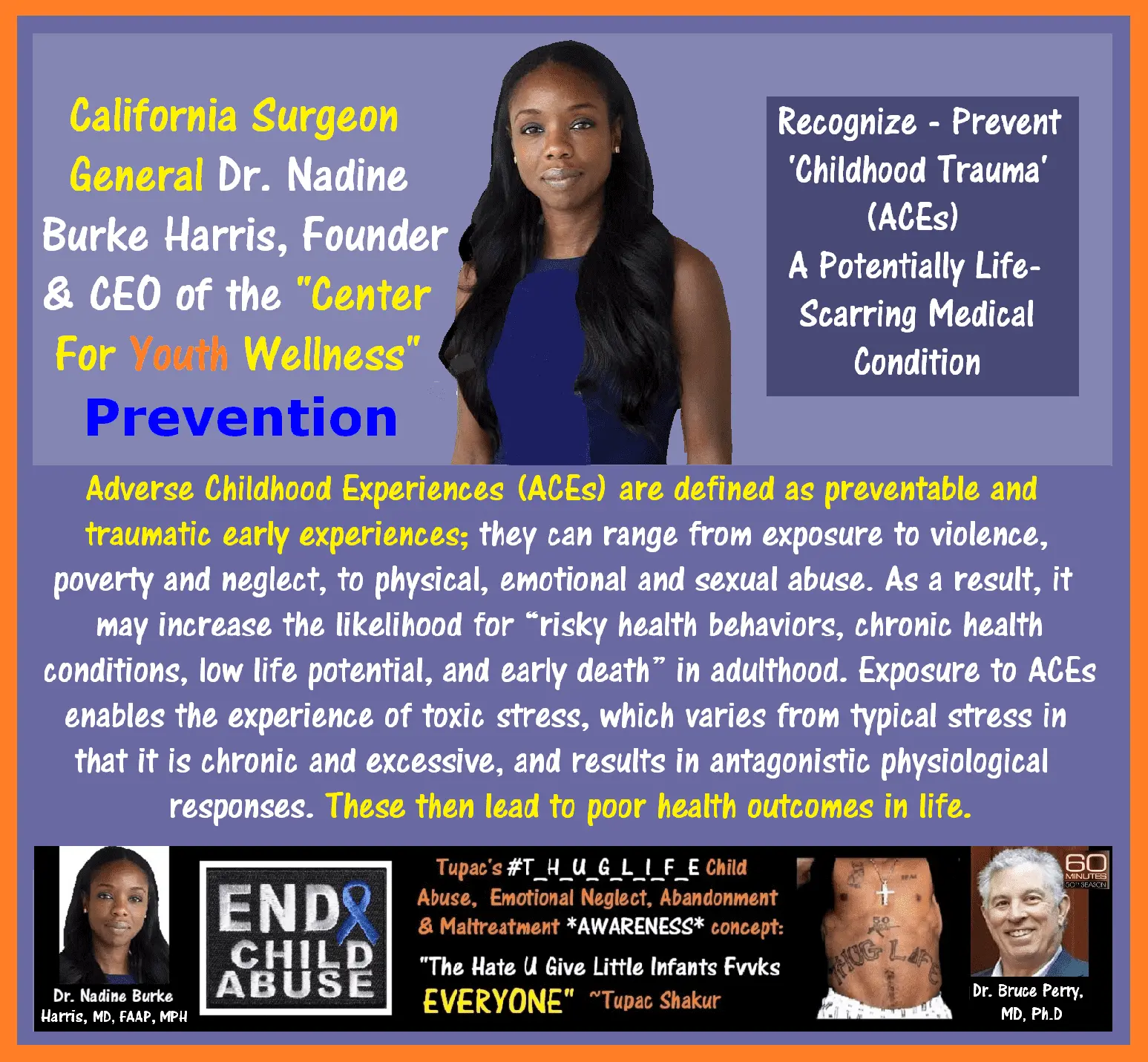 Child Abuse Awareness, PREVENTION & Education Advocate, pediatrician Dr. Nadine Burke Harris, MD, FAAP, MPH, Founder and CEO of the 'Center for Youth Wellness' has been appointed California's very first Surgeon General.