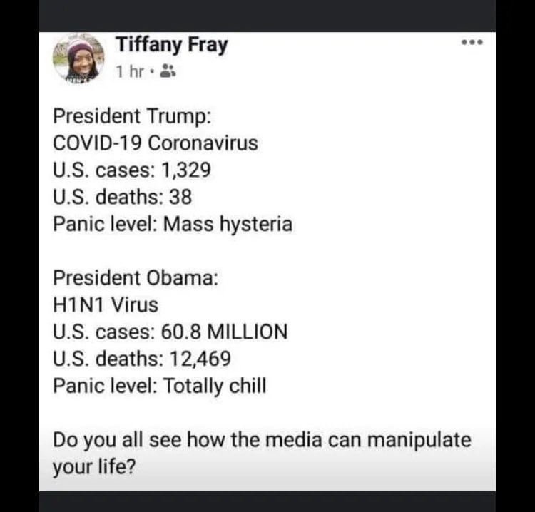 Spradlin on March 13, Spradlin posted a highly misleading meme comparing COVID-19 and swine flu deaths, suggesting that the current virus response was “mass hysteria” created by the media for no reason other than to hurt Donald Trump:
