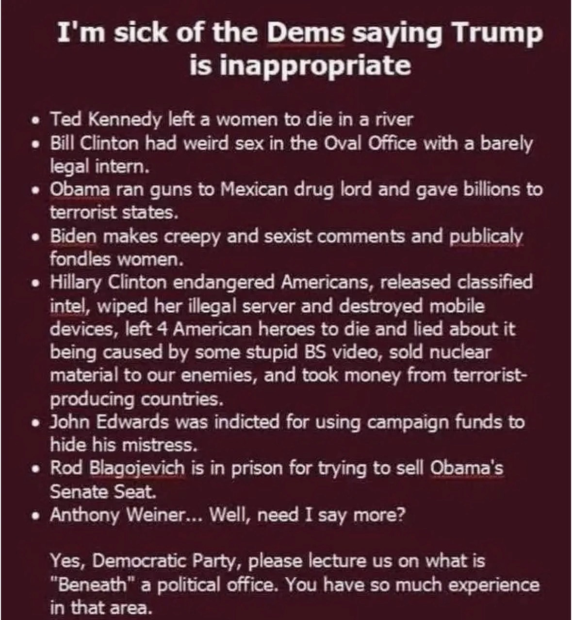 Bill Clinton - Do you forget the blue dress? In the White House? Then, there's the many other rape cases that Democrats ignored. And, Epstein Island.