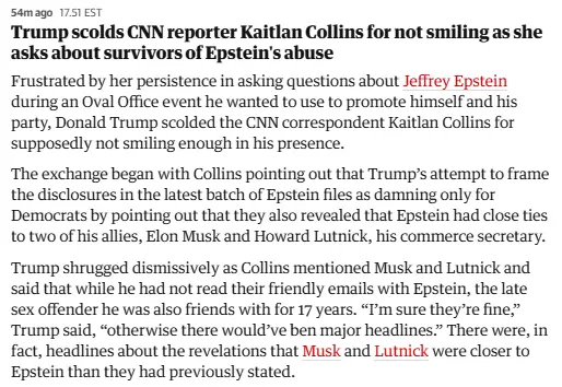 President replied to Collins’ persistent questions about Epstein files by accusing her of not smiling ‘because you know you’re not telling the truth’www.theguardian.com